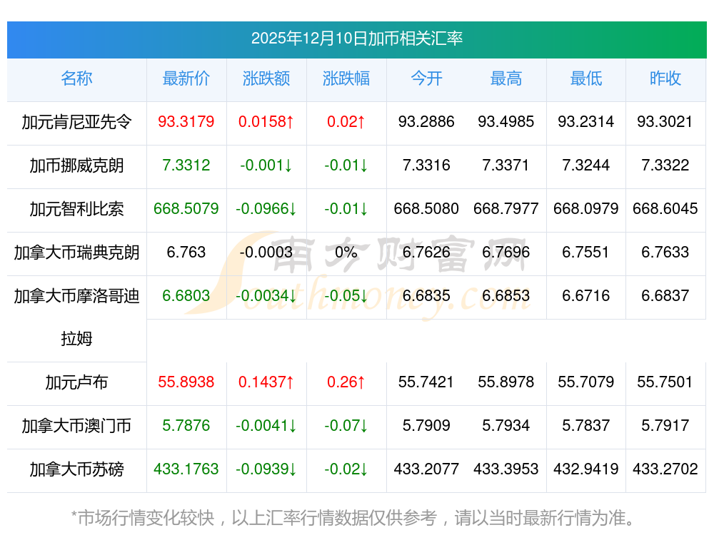 根據(jù)2025年12月10日匯率計算,CAD兌換MYR匯率最新價2.973400,今開價2.9712,昨收價2.9717,最高價2.9762,最低價2.9701。