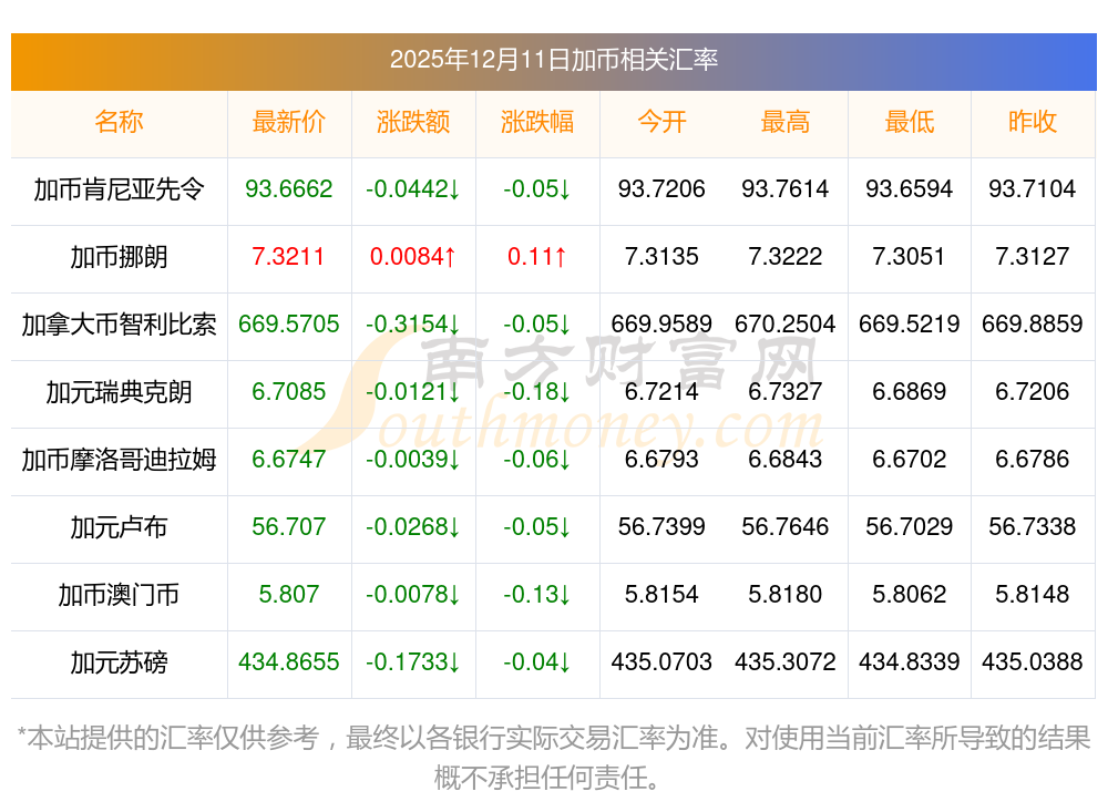 根據(jù)今天2025年12月11日匯率計(jì)算,CAD兌換NOK匯率最新價(jià)7.321100,今開價(jià)7.3135,昨收價(jià)7.3127,最高價(jià)7.3222,最低價(jià)7.3051。