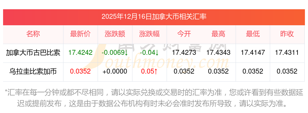 根據(jù)2025年12月16日匯率計算,CAD兌換CUP匯率最新價17.424200:今日開價17.4273,昨日收價17.4311,最高價17.4343,最低價17.4147。