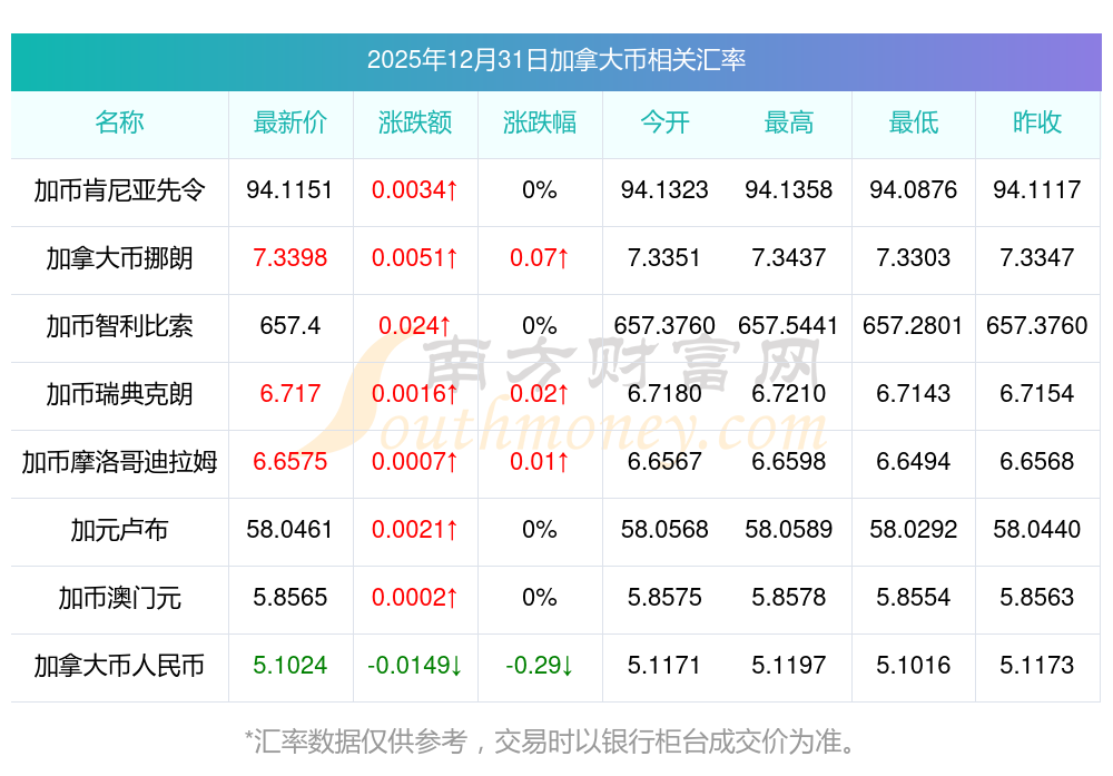 2025年12月31日加拿大幣相關(guān)匯率查詢