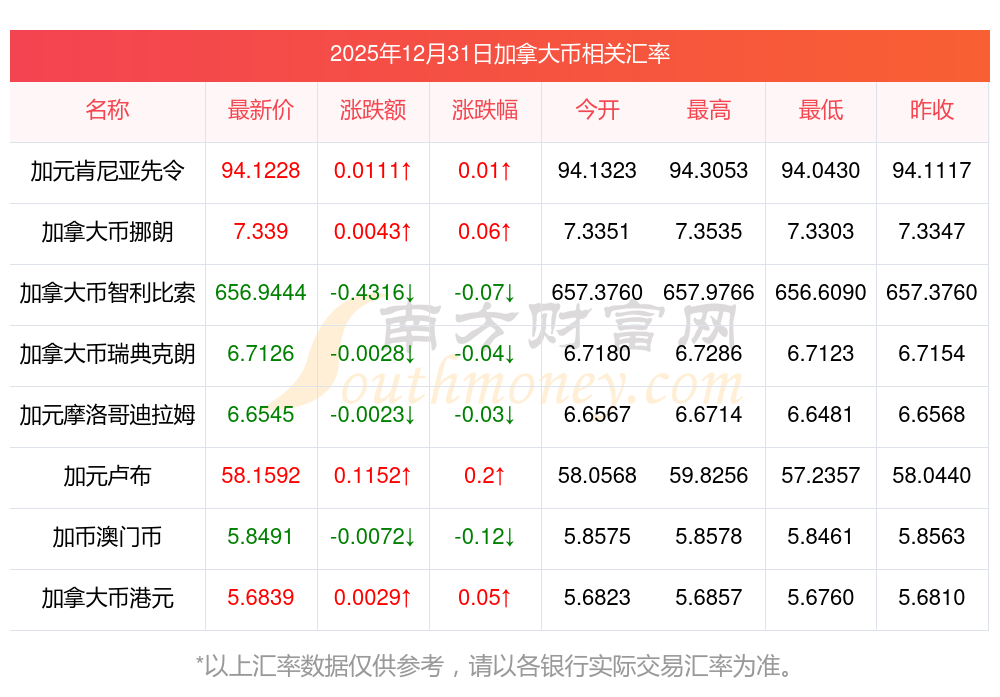 2025年12月31日加拿大幣相關(guān)匯率查詢