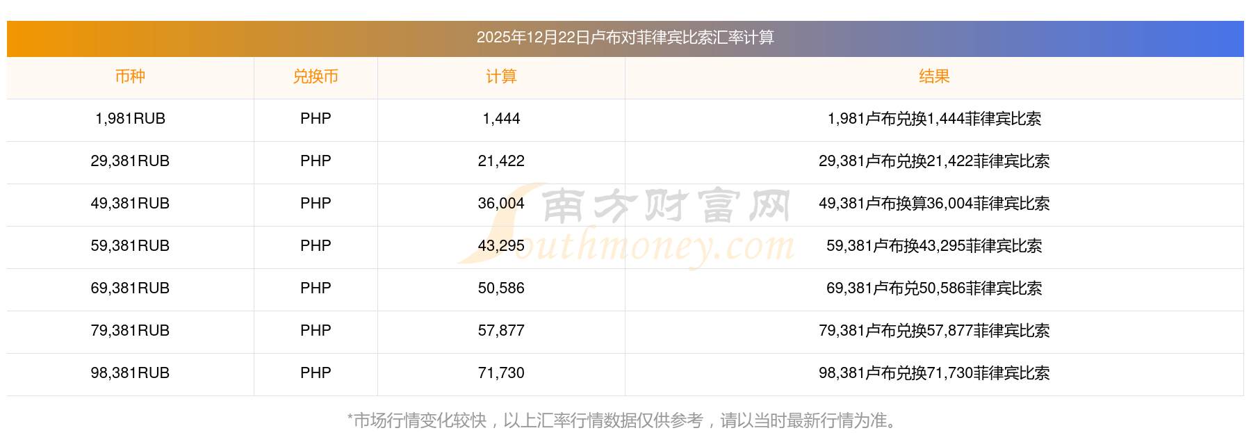 南方財(cái)富網(wǎng)為您提供盧布對(duì)菲律賓比索匯率最新價(jià)格詳情。