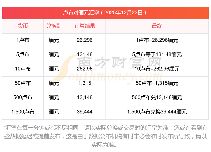 根據(jù)今日匯率:1盧布、2盧布、5盧布、10盧布、20盧布、50盧布、100盧布,分別折合緬元26.296、52.592、131.48、262.96、525.92、1314.8、2629.6緬元。