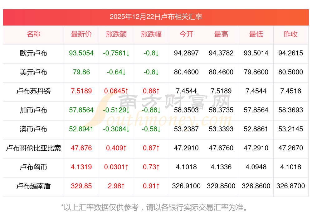 根據(jù)2025年12月22日匯率計算,RUB兌換NZD匯率最新價0.021730:今開價0.0216,昨收價0.0216,最高價0.0217,最低價0.0215。