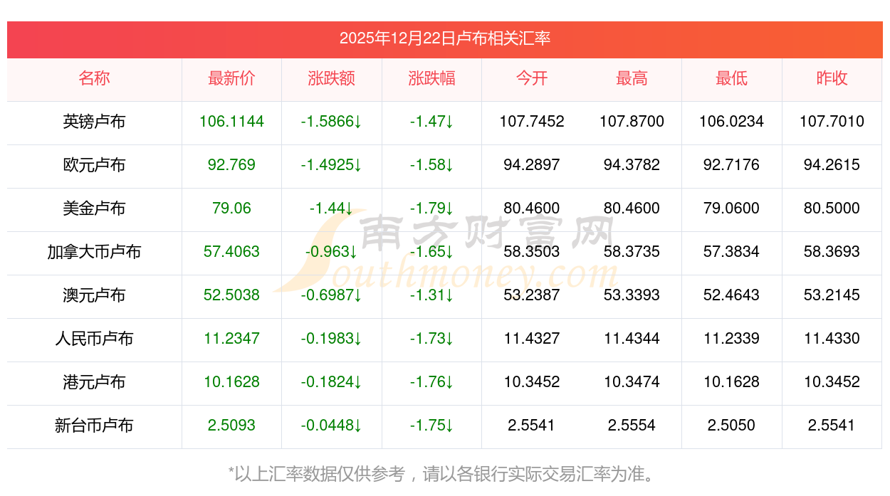 根據(jù)2025年12月22日匯率,盧布兌換蘇丹鎊匯率最新7.555776,今開7.4544,昨收7.4516,最高7.5902,最低7.4544。