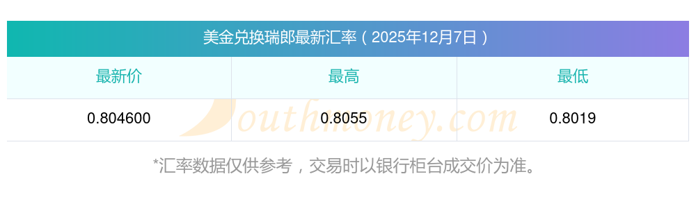 今日瑞郎匯率行情:100美元兌瑞郎匯率多少(2025年12月7日)