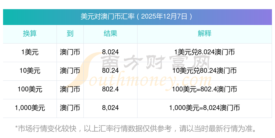 南方財富網(wǎng)為您提供美元對澳門幣匯率最新價格詳情。