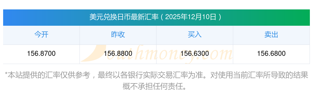 日幣今日匯率實(shí)時查詢 美元對日幣匯率2025年12月10日