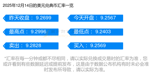 2025年12月14日美元兌換典幣的匯率為:9.2699