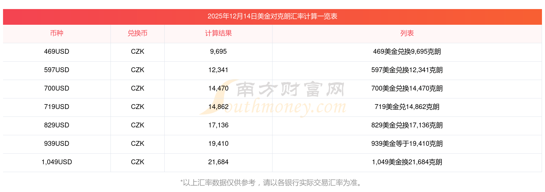 匯率實(shí)時(shí)更新!66美金兌換克朗匯率表(2025年12月14日)