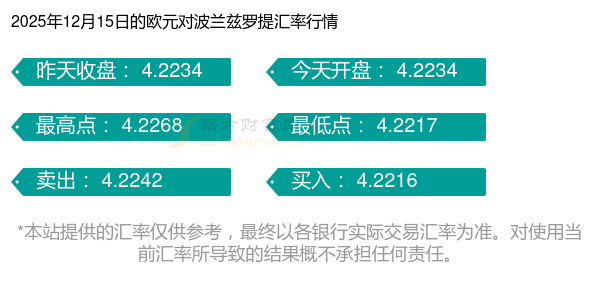 2025年12月15日歐元換波蘭茲羅提的匯率為:4.2229