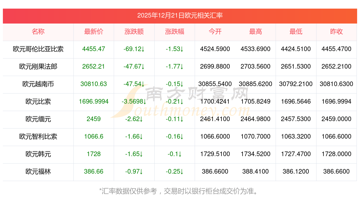 根據(jù)2025年12月21日匯率計(jì)算,EUR兌換HUF匯率最新價(jià)386.660000:今開價(jià)386.6600,昨收價(jià)386.6600,最高價(jià)388.4100,最低價(jià)386.1200。