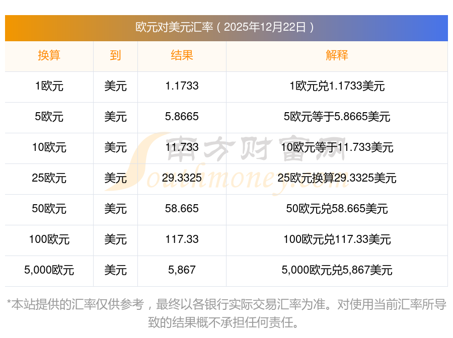 南方財富網(wǎng)為您提供歐元對美元匯率最新價格詳情。