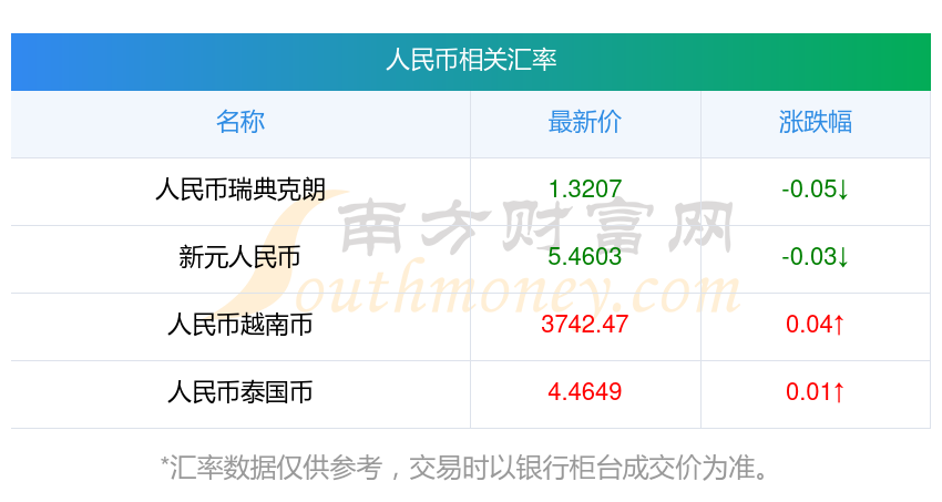 南方財(cái)富網(wǎng)為您提供人民幣對(duì)泰國(guó)幣匯率最新價(jià)格詳情。