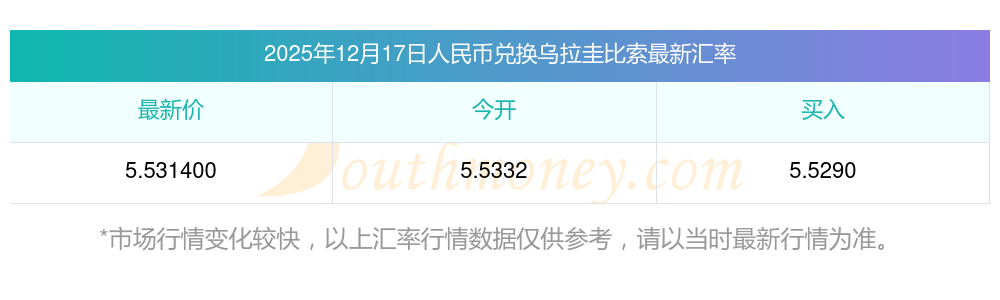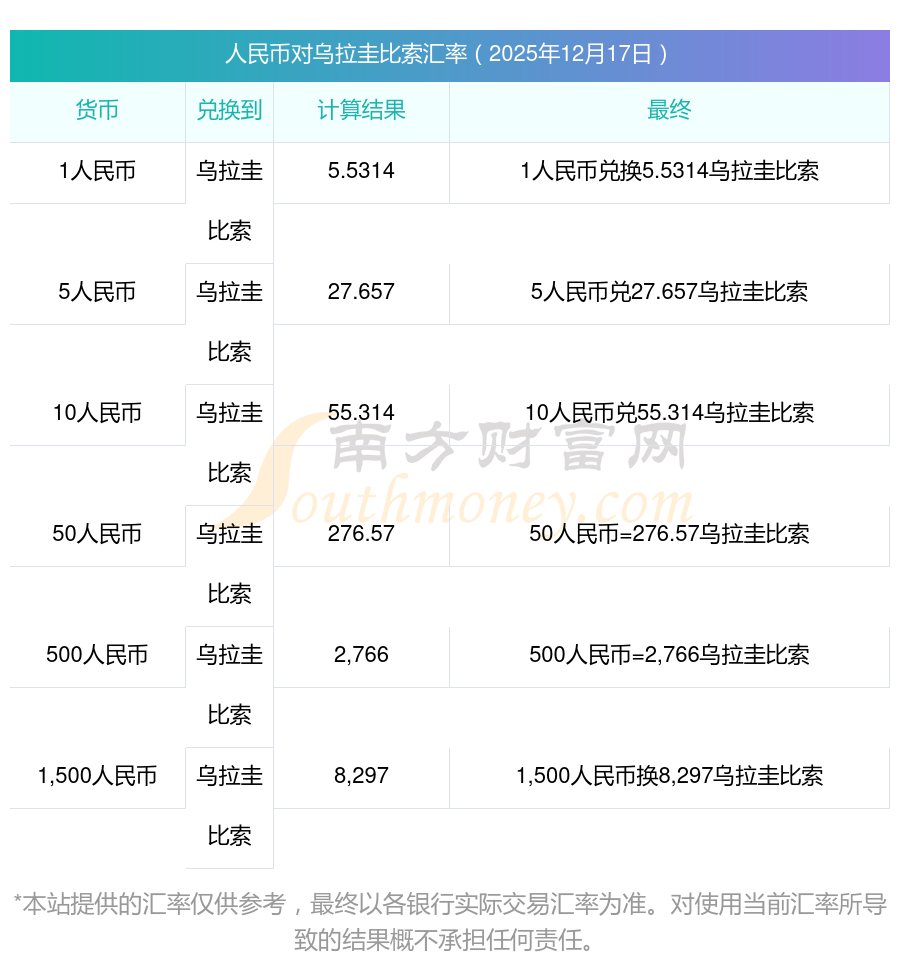 今日人民幣匯價(jià):2025年12月17日39人民幣兌烏拉圭比索匯價(jià)一覽表