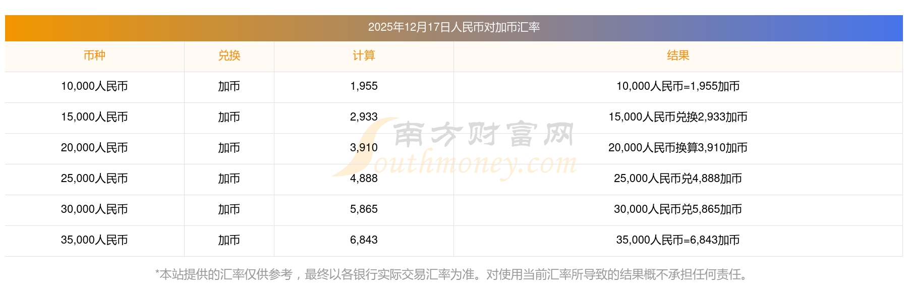 匯價查詢:2025年12月17日人民幣兌加幣匯價一覽
