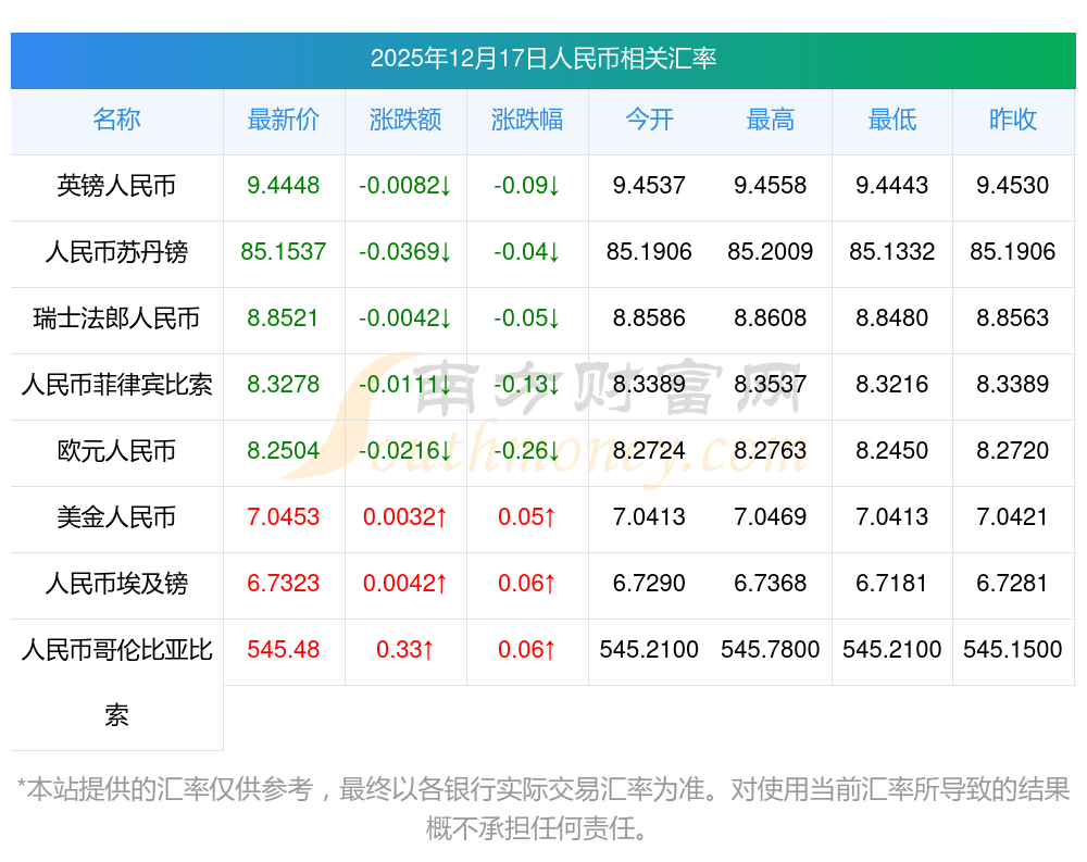 2025年12月17日最新消息,人民幣兌換瑞士法郎最新匯率為0.113350,今開為0.1129,昨收為0.1129,最高為0.1134,最低為0.1129。