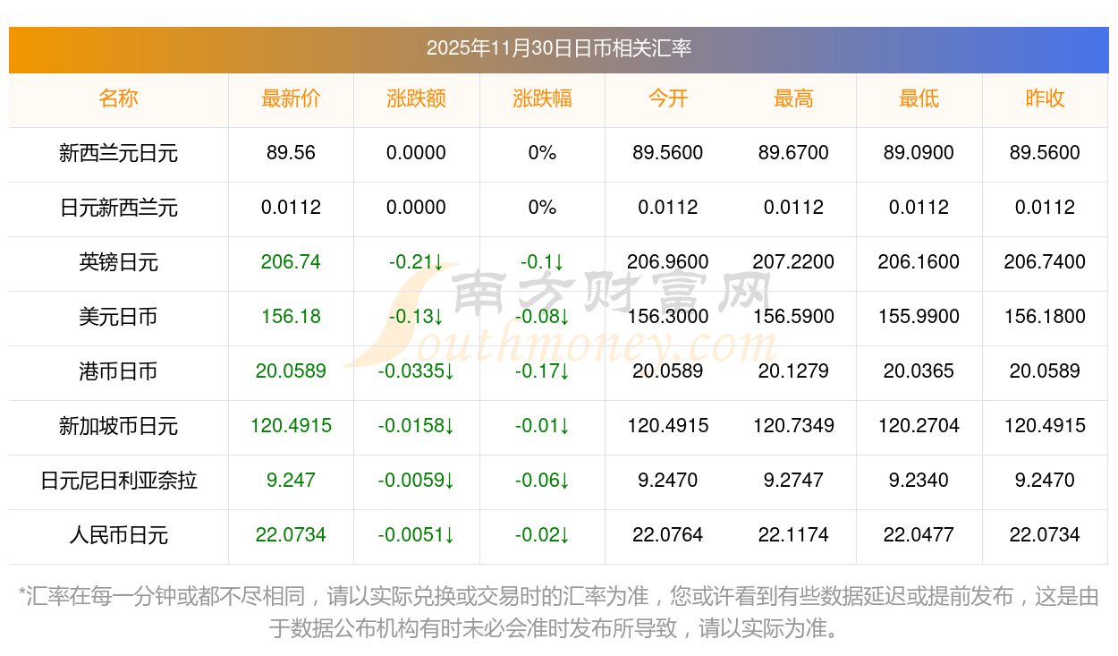 根據(jù)2025年11月30日匯率,日幣兌換臺(tái)幣匯率最新0.201000,今開(kāi)0.2003,昨收0.2010,最高0.2015,最低0.2001。