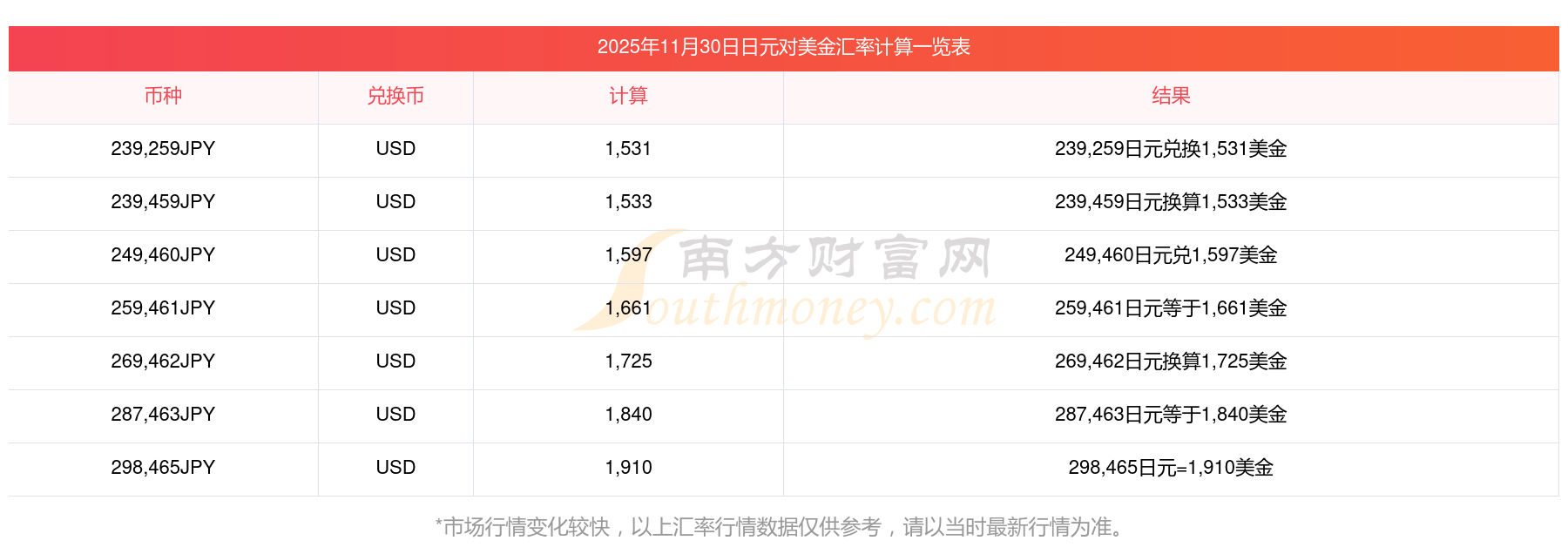 南方財富網(wǎng)為您提供日元對美金匯率最新價格詳情。