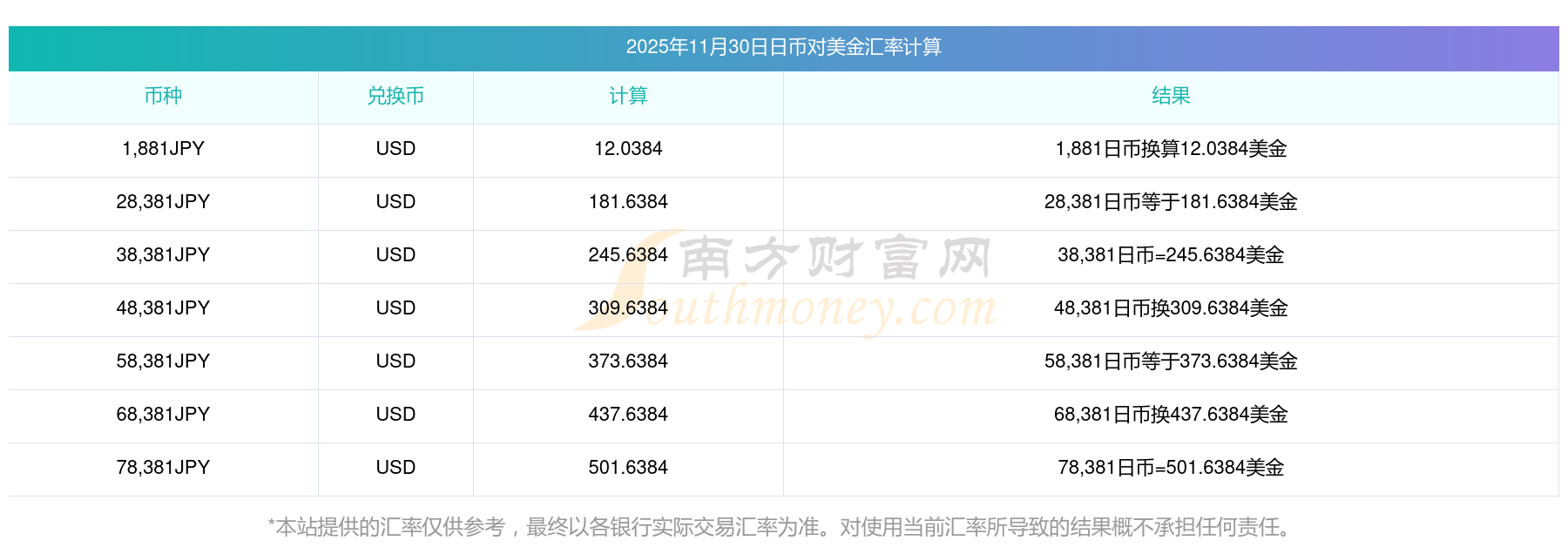 南方財(cái)富網(wǎng)為您提供日幣對(duì)美金匯率最新價(jià)格詳情。