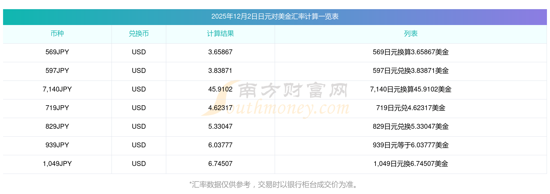 南方財(cái)富網(wǎng)為您提供日元對(duì)美金匯率最新價(jià)格詳情。