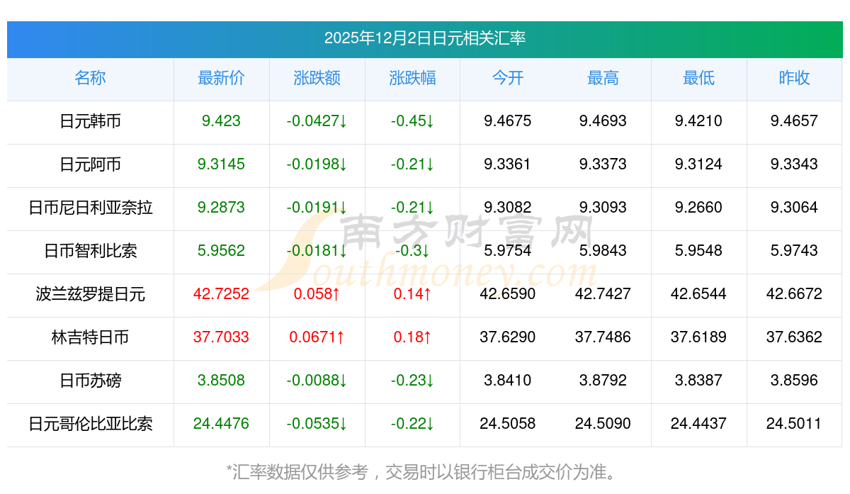 根據(jù)2025年12月2日匯率,日元兌換韓幣匯率最新價9.423000,今開價9.4675,昨收價9.4657,最高價9.4693,最低價9.4210。