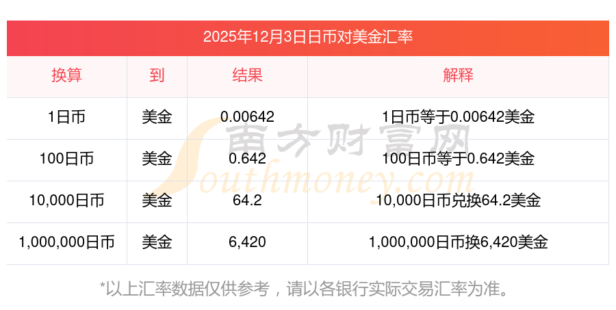 南方財富網(wǎng)為您提供日幣對美金匯率最新價格詳情。