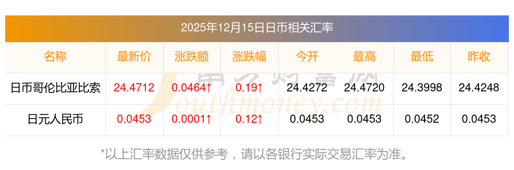 根據(jù)2025年12月15日匯率,日幣兌換哥倫比亞比索匯率最新價(jià)24.471200,今開(kāi)價(jià)24.4272,昨收價(jià)24.4248,最高價(jià)24.4720,最低價(jià)24.3998。