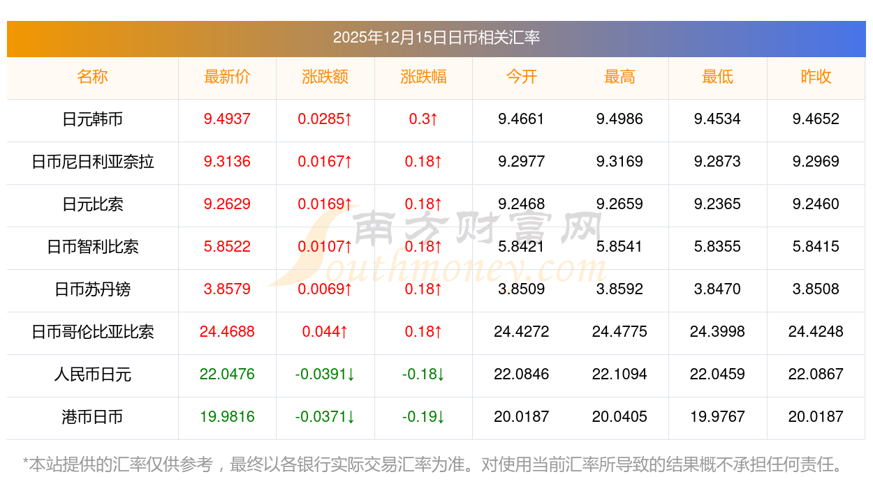 2025年12月15日最新消息,日幣兌換盧布最新匯率為0.514725,今開為0.5138,昨收為0.5137,最高為0.5148,最低為0.5132。