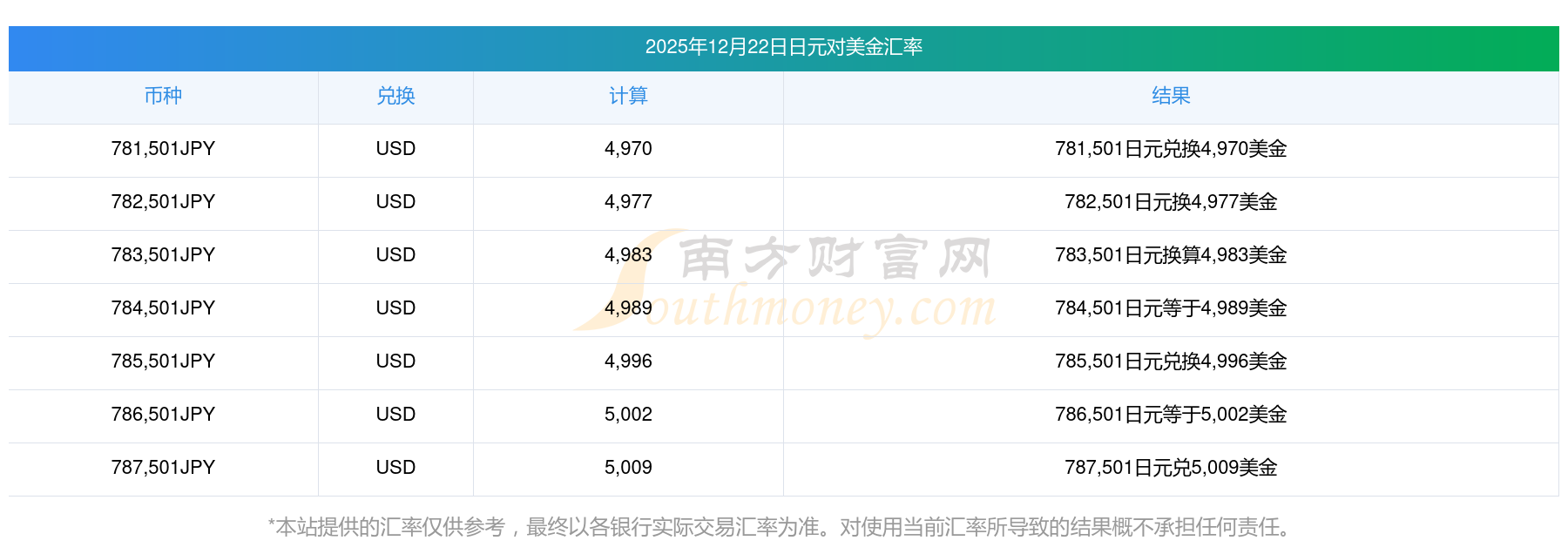 2025年12月22日,貨幣兌換:1日元=0.00636美金。舉例:假如一瓶礦泉水需要1日元,則需美金:0.00636美金。