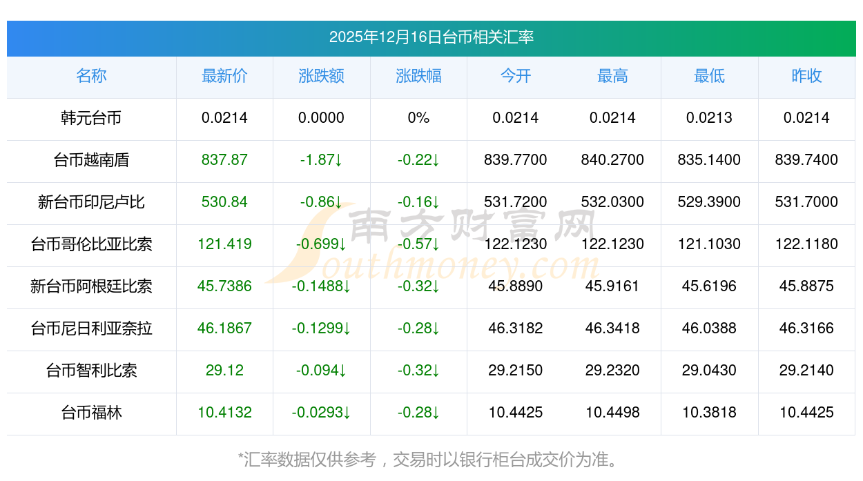 2025年12月16日臺(tái)幣相關(guān)匯率查詢