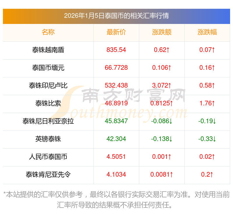 2026年1月5日泰國(guó)幣相關(guān)匯率查詢