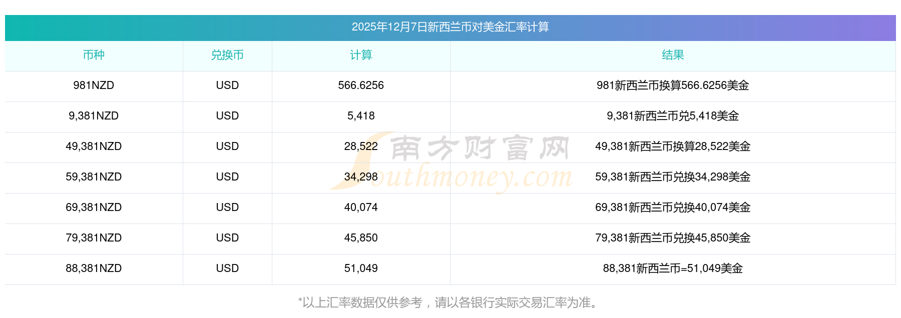 2025年12月7日匯率行情:17新西蘭幣對美金匯率多少
