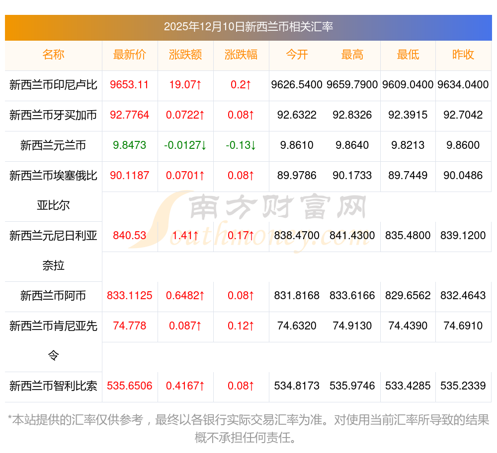 2025年12月10日新西蘭幣相關(guān)匯率查詢