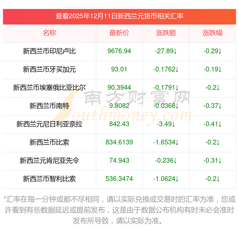 2025年12月11日新西蘭元相關(guān)匯率查詢