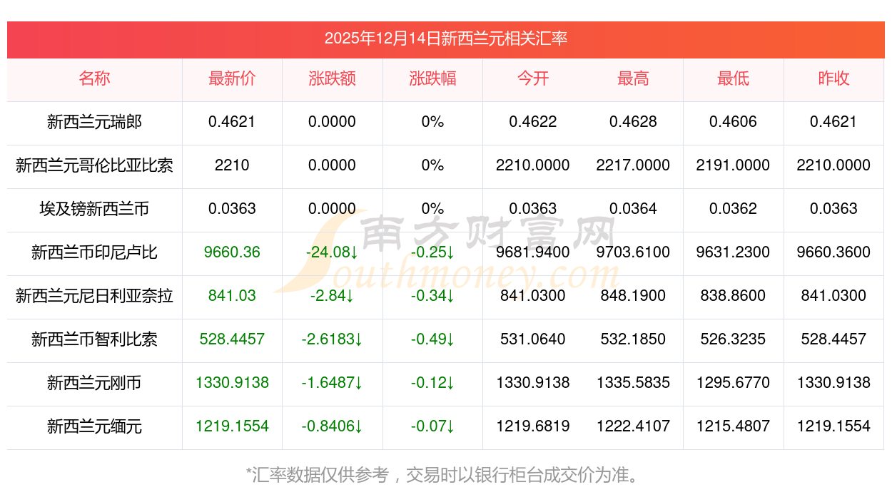 2025年12月14日新西蘭元相關(guān)匯率查詢
