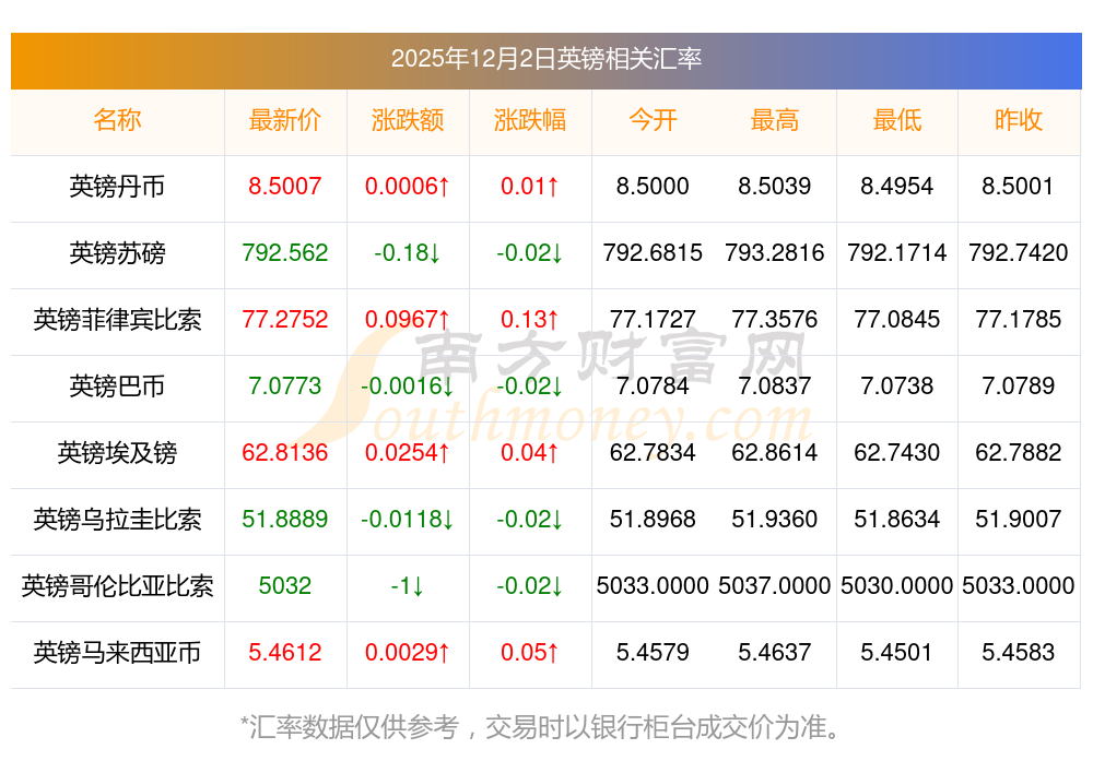 根據(jù)2025年12月2日匯率,英鎊兌換泰銖匯率最新價42.314000,今開價42.3180,昨收價42.3210,最高價42.3650,最低價42.2420。