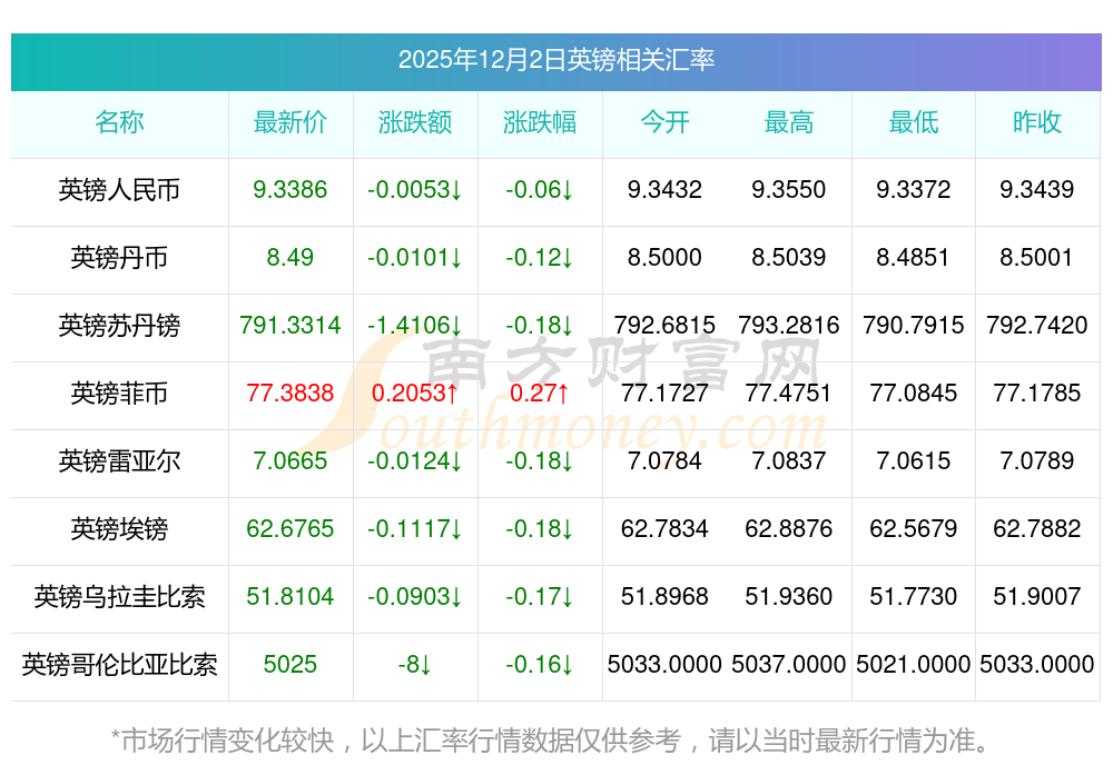根據(jù)2025年12月2日匯率計(jì)算,英鎊兌換挪幣匯率最新價(jià)13.393300,今開價(jià)13.3867,昨收價(jià)13.3883,最高價(jià)13.4157,最低價(jià)13.3718。