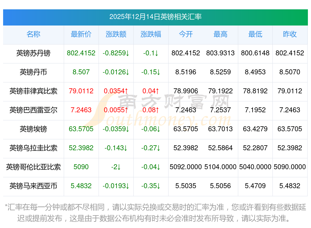 根據(jù)2025年12月14日匯率,英鎊兌換蘇丹鎊匯率最新802.415200,今開802.4152,昨收802.4152,最高803.9313,最低800.6148。