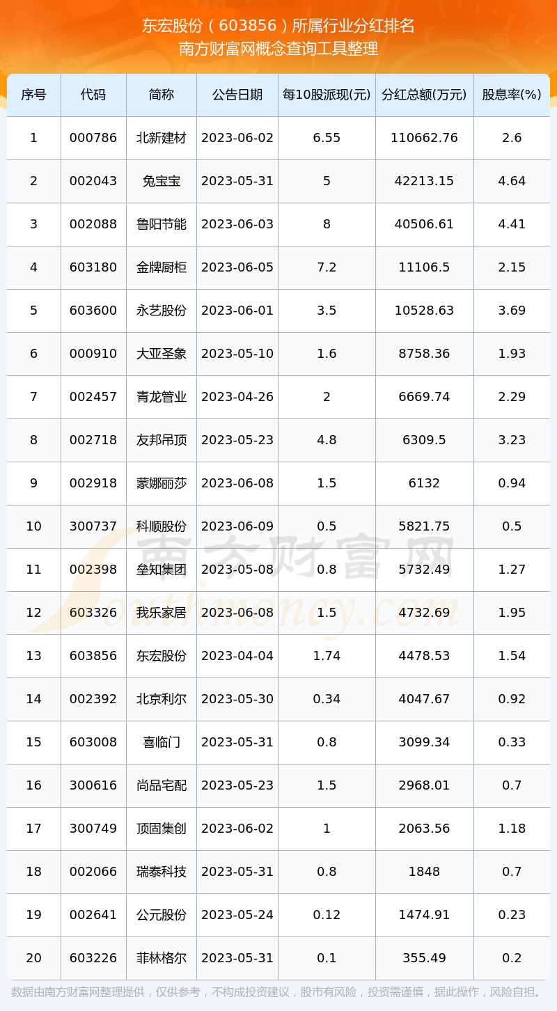 按照南方財富網(wǎng)趨勢選股系統(tǒng)統(tǒng)計,東宏股份所屬行業(yè)為裝修建材行業(yè),裝修建材行業(yè)分紅排名情況如下表: