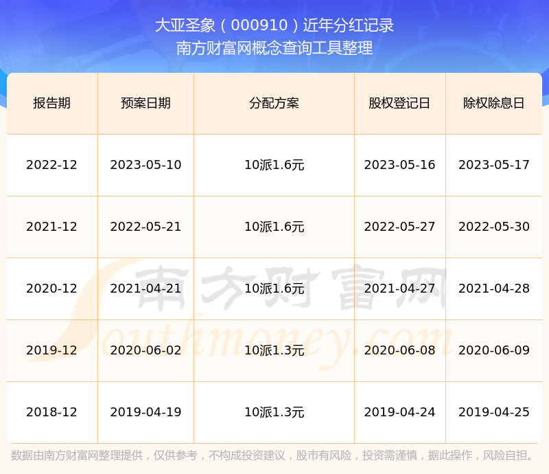 大亞圣象最新一次公布的分紅方案為10派1.6元。本次權(quán)益分派股權(quán)登記日為2023年5月16日,除權(quán)除息日為2023年5月17日,派息日為2023年5月17日。