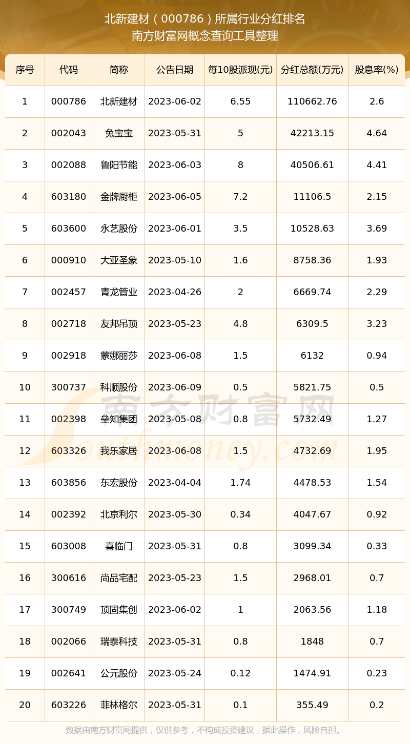 按照南方財(cái)富網(wǎng)趨勢選股系統(tǒng)統(tǒng)計(jì),北新建材所屬行業(yè)為石膏板行業(yè),石膏板行業(yè)分紅排名情況如下表: