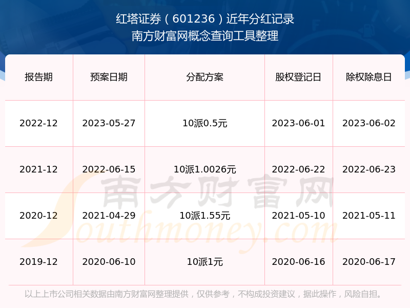 紅塔證券最新一次公布的分紅方案為10派0.5元。本次權(quán)益分派股權(quán)登記日為2023年6月1日,除權(quán)除息日為2023年6月2日,派息日為2023年6月2日。