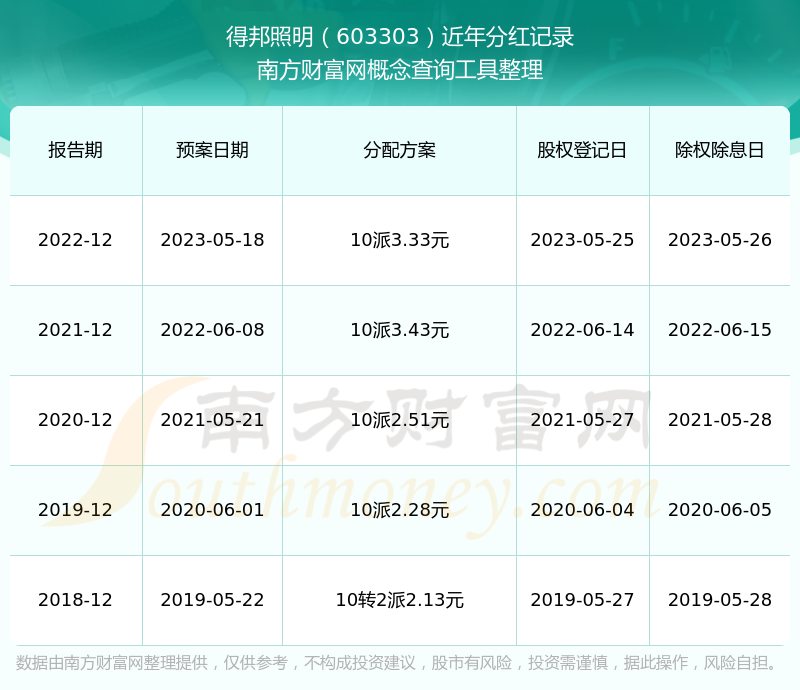 得邦照明最新一次公布的分紅方案:10派3.33元。