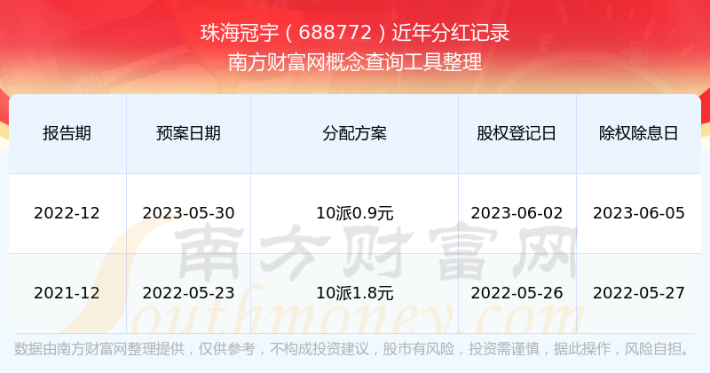 珠海冠宇最新一次公布的分紅方案為10派0.9元。本次權(quán)益分派股權(quán)登記日為2023年6月2日,除權(quán)除息日為2023年6月5日,派息日為2023年6月5日。