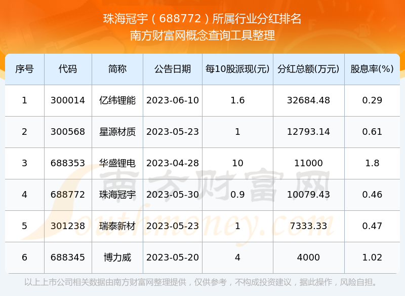 按照南方財(cái)富網(wǎng)趨勢選股系統(tǒng)統(tǒng)計(jì),珠海冠宇所屬行業(yè)為鎳氫電池行業(yè),鎳氫電池行業(yè)分紅排名情況如下表: