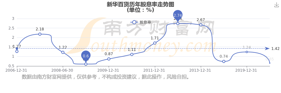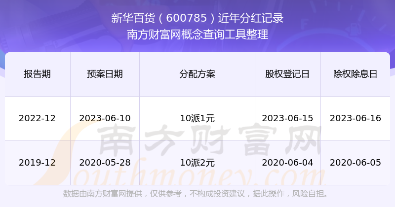 新華百貨最新一次公布的分紅方案為10派1元。本次權(quán)益分派股權(quán)登記日為2023年6月15日,除權(quán)除息日為2023年6月16日,派息日為2023年6月16日。