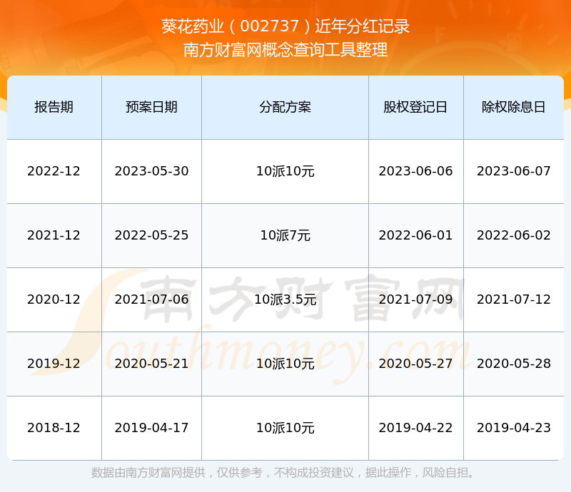 葵花藥業(yè)最新一次公布的分紅方案為10派10元。本次權(quán)益分派股權(quán)登記日為2023年6月6日,除權(quán)除息日為2023年6月7日,派息日為2023年6月7日。