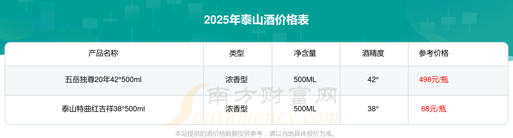 五岳獨(dú)尊20年42°500ml參考價(jià)498元/瓶、泰山特曲紅吉祥38°500ml參考價(jià)88元/瓶。