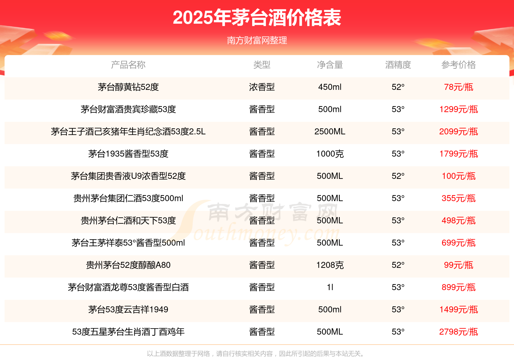 2025茅臺酒最新價格:華茅鑒藏 醬香型白酒 3L 53°參考價8388元/瓶、53度五星茅臺生肖酒丁酉雞年參考價2798元/瓶、貴州茅臺己亥豬年生肖酒53°500ml參考價2699元/瓶。